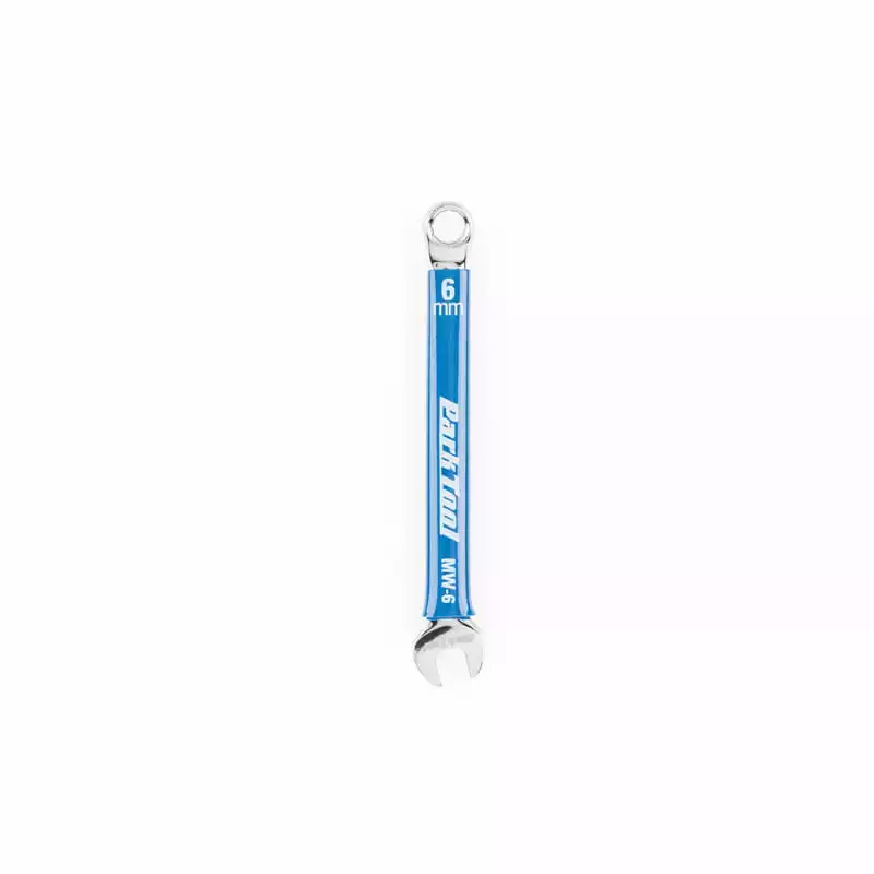 Een ring- en steeksleutel in Park Tool kwaliteit met een bekbreedte van 6 mm. Gesmeed chroom vanadium staal, gepolijst chroom en met blauwe plastic coating in het handvat gedeelte. Stevig, comfortabel en gewoonweg mooi. Een must voor elke schroevendraaier!
